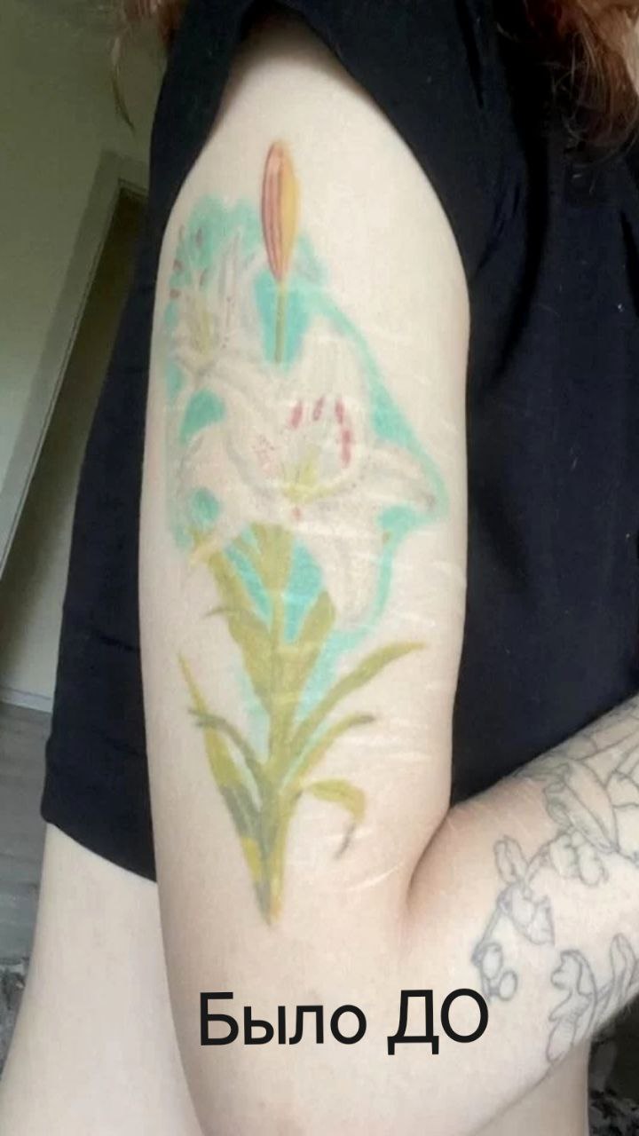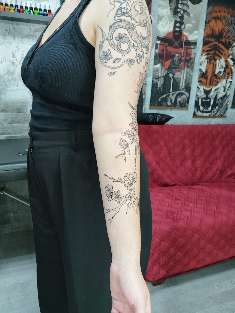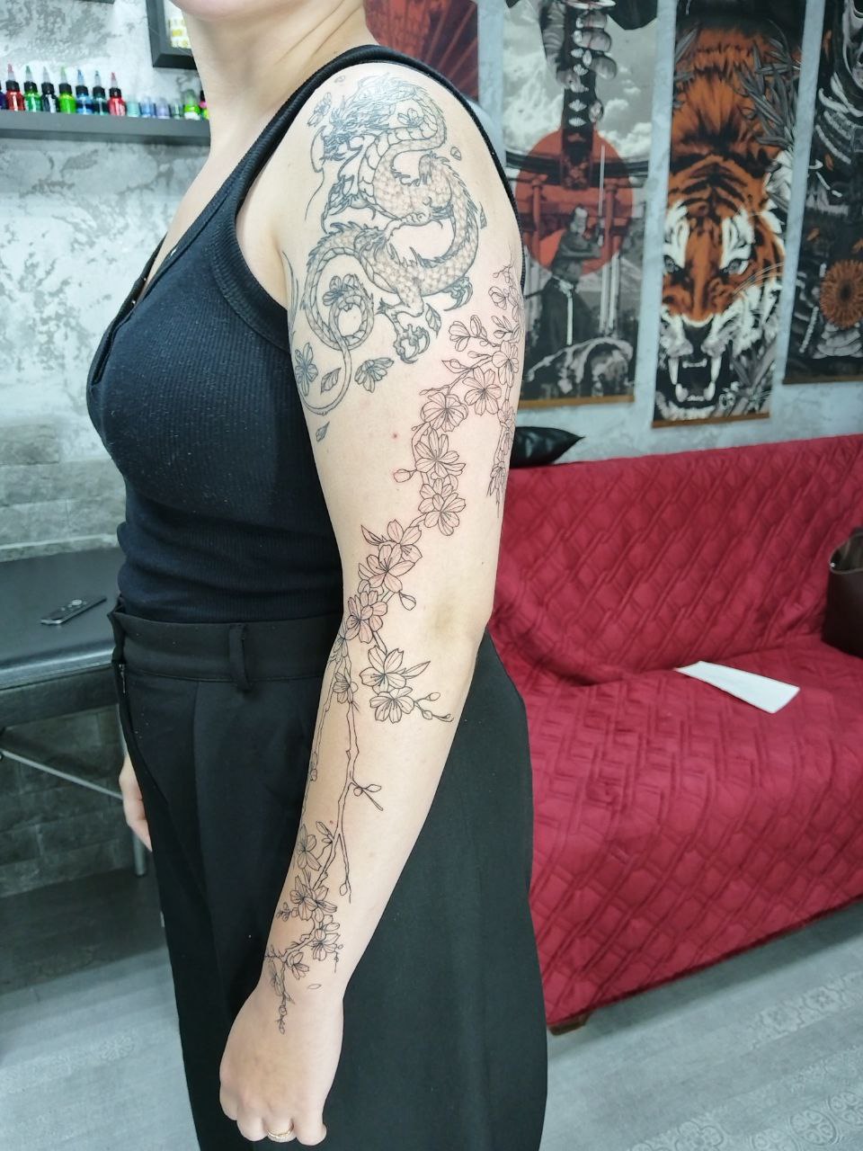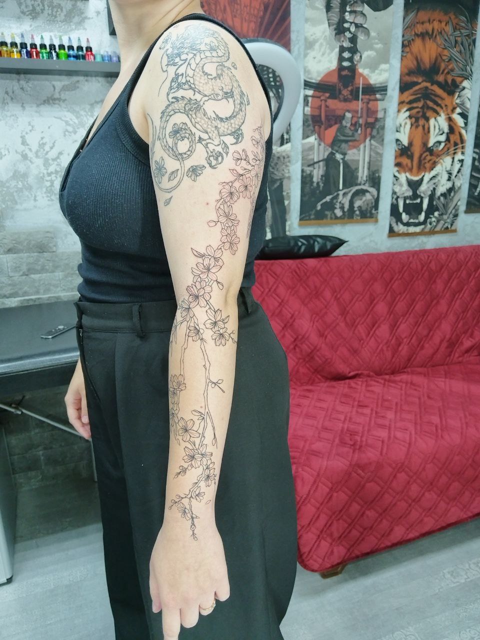 Добавили ветку сакуры на руку, чтобы исправить композицию. Старая татуировка дракона расположена высоко и очень маленькая, выглядит как рукав от футболки.